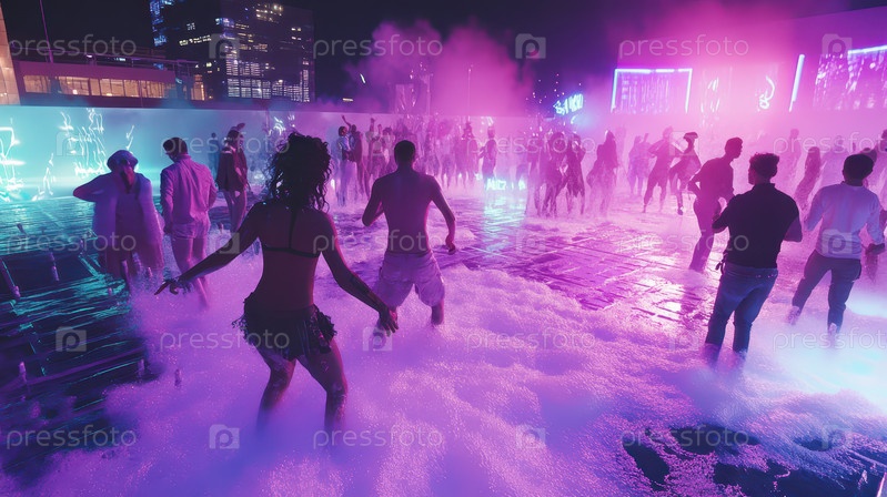 Футуристическая вечеринка у бассейна с неоновым светом ночью