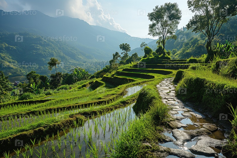 Зеленая тропическая долина с террасным земледелием