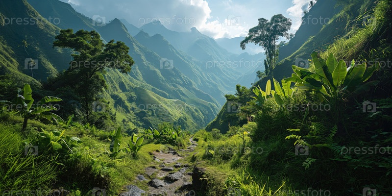 Красивый пейзаж высокогорной долины с тропической растительностью и террасными полями на заднем плане
