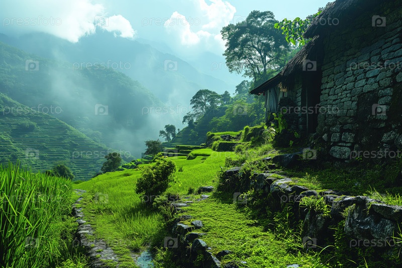 Высокогорный тропический горный сельский пейзаж с террасными полями