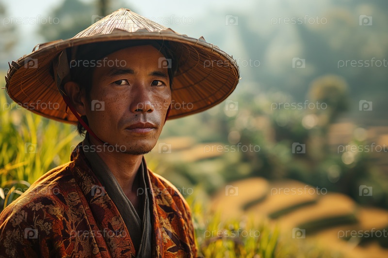 Азиатский сельский мужчина в народной одежде на фоне долины с сельскохозяйственными террасами