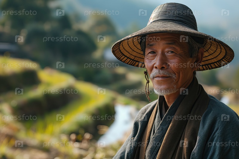 Азиатский сельский мужчина в народной одежде на фоне долины с сельскохозяйственными террасами