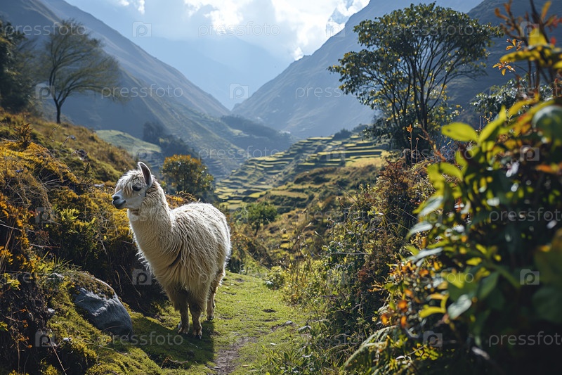 Лама на фоне долины в Андах с террасными полями
