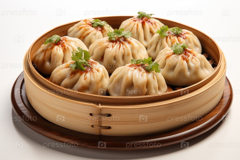 Баоцзы в бамбуковой пароварке на светлом фоне