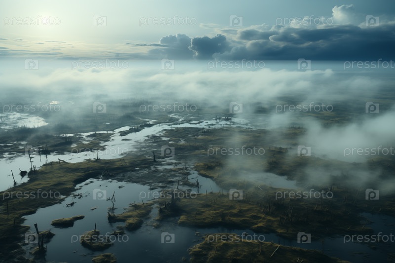 Вид с воздуха на обширные болота, покрытые туманом