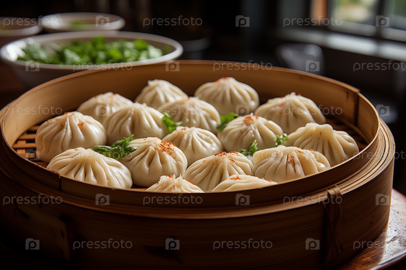 Баоцзы в бамбуковой пароварке на столе