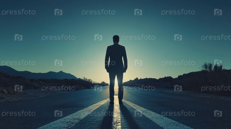 Силуэт мужчины, стоящего на пустой дороге на рассвете
