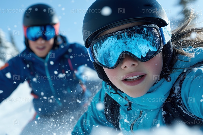 Сноубордист в шлеме и очках развлекается на свежем снегу в горах