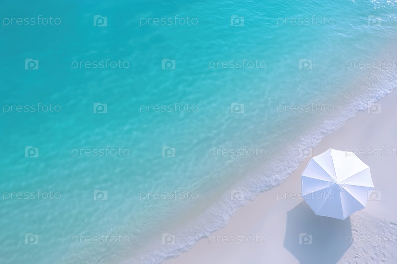 Белый зонтик на пляже с бирюзовой водой и белым песком, вид сверху