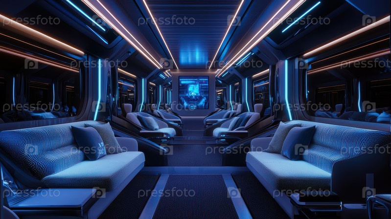 Футуристический интерьер поезда с неоновыми огнями