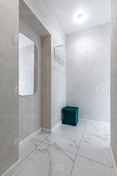 Стильная минималистская прихожая с зеленым бархатным пуфом, белой вешалкой для одежды, современным арочным зеркалом и мраморным полом