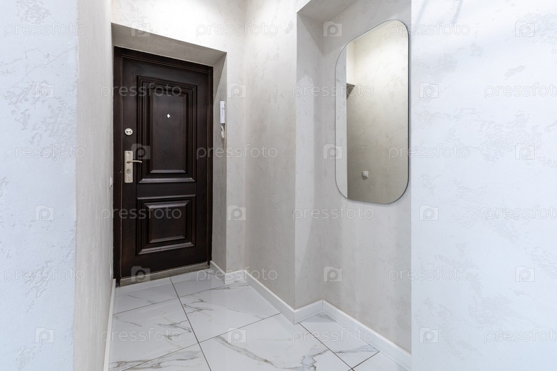 Современная минималистская прихожая с темной деревянной дверью, арочным зеркалом, светлыми стенами и мраморным полом, создающими элегантный и элегантный вид