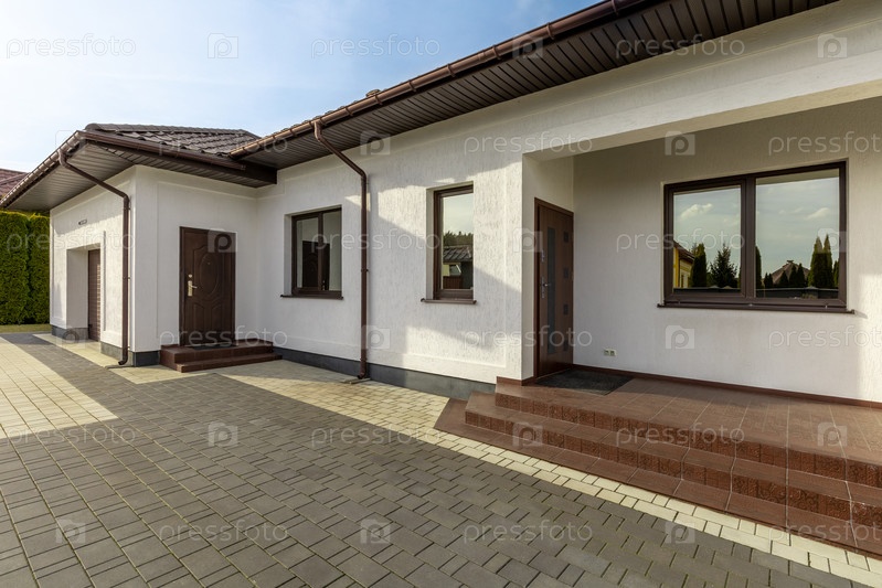Современный загородный дом с белыми стенами, коричневой крышей, кирпичными ступенями и большими окнами, создающими стильный и гостеприимный внешний вид