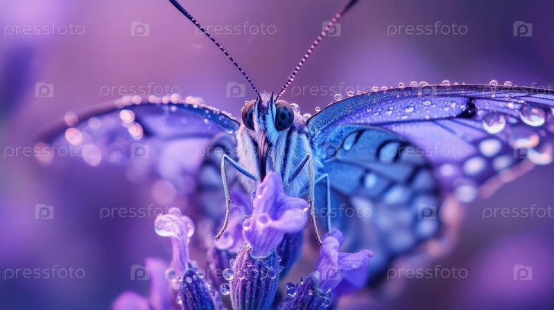 Макрофотография бабочки на лаванде с капельками росы