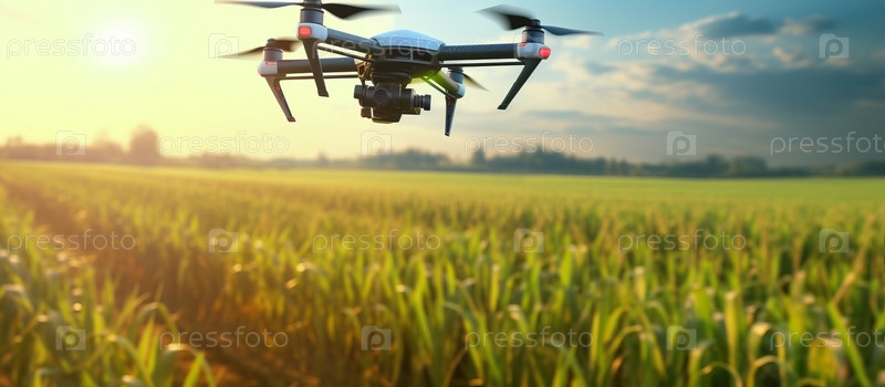 Беспилотный квадрокоптер на зеленом кукурузном поле