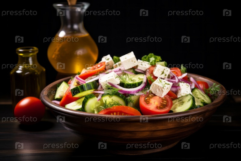 Красочный салат с листьями салата, помидорами, огурцами, морковью и сыром с бутылочкой заправки