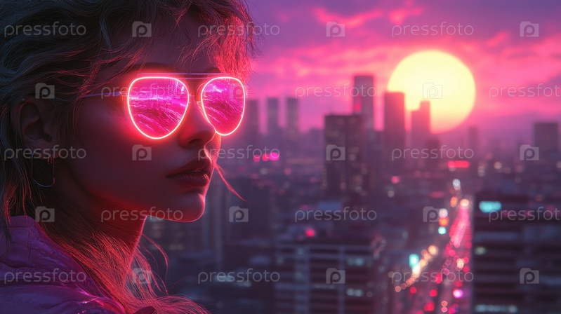 Неоновый городской пейзаж на закате с футуристическими вибрациями и яркими цветами