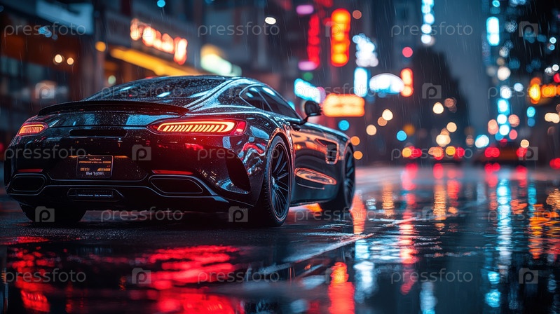 Элегантный спортивный автомобиль в ярком ночном городском пейзаже
