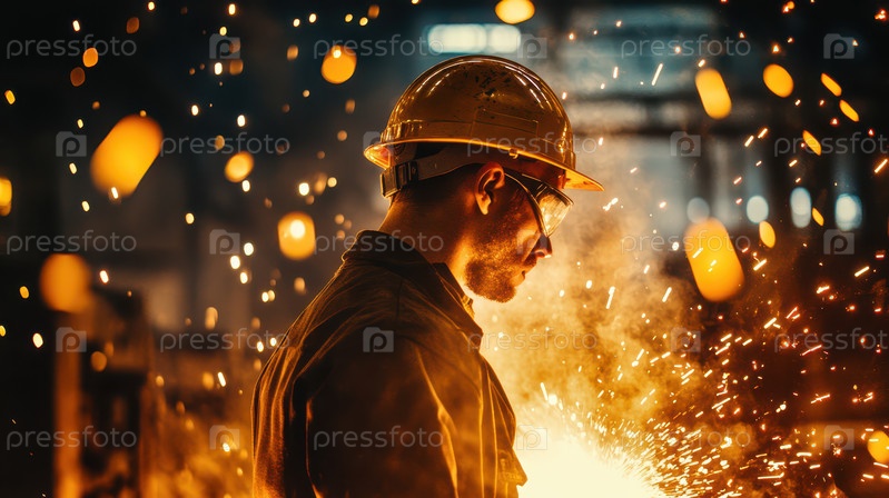 Сталевар в защитном снаряжении и светящиеся искры в литейном цехе