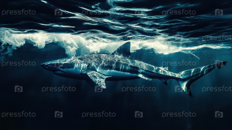 Акула плывет под темными океанскими волнами со световыми отражениями