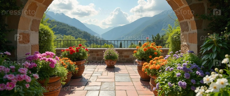 Солнечная терраса, окруженная яркими цветами, располагает к отдыху, предлагая захватывающий вид и уютное место со столиками и стульями. Терраса украшена цветущими цветами и живописными горами. Генеративный ИИ