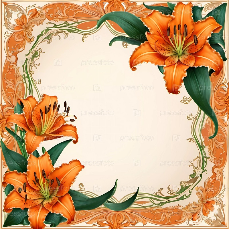 Яркая композиция из оранжевых лилий создает красивую границу вокруг пустого пространства, идеально подходит для создания персонализированных заметок или приглашений. Цветочный дизайн добавляет нотку элегантности и тепла. Генеративный ИИ