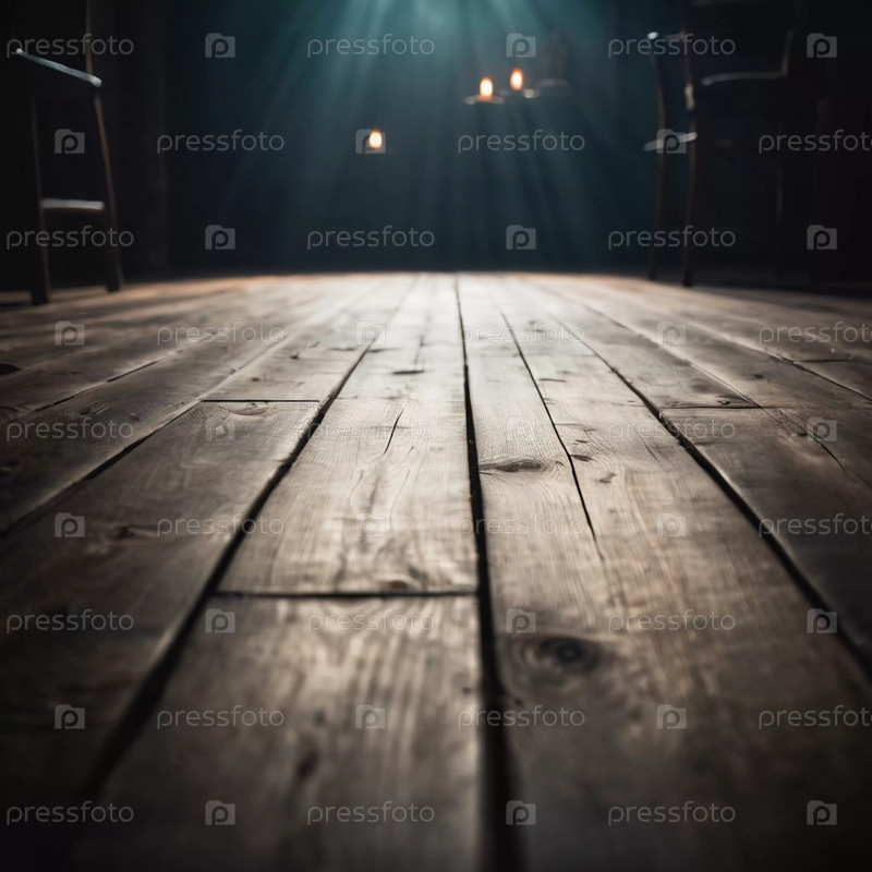 Впереди тянется темный коридор, освещенный слабым верхним светом, который создает зловещие тени на деревянном полу, создавая леденящую атмосферу. Генеративный ИИ