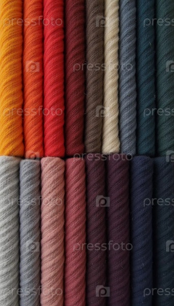 Различные образцы шерстяной ткани разных цветов аккуратно организованы, демонстрируя яркую палитру, идеально подходящую для текстильного дизайна и творческих проектов. Генеративный ИИ