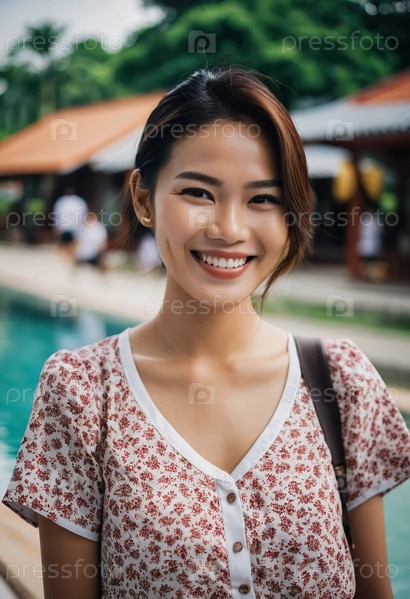 Веселая женщина стоит у бассейна, демонстрируя свою теплую улыбку. Окруженная зеленью и традиционной архитектурой, она наслаждается расслабляющим днем в Таиланде. Генеративный ИИ