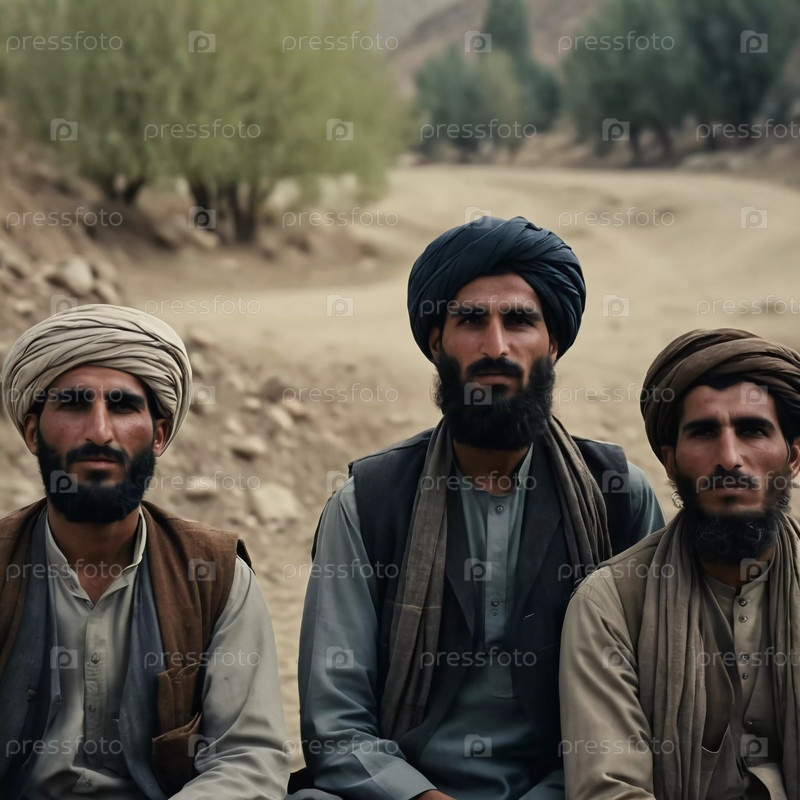 Группа вооруженных мужчин, одетых в традиционную одежду, стоит сплоченно, демонстрируя товарищество и готовность. Воинствующие мусульмане, похожие на Талибан или пакистанскую армию. Густая борода. Генеративный ИИ