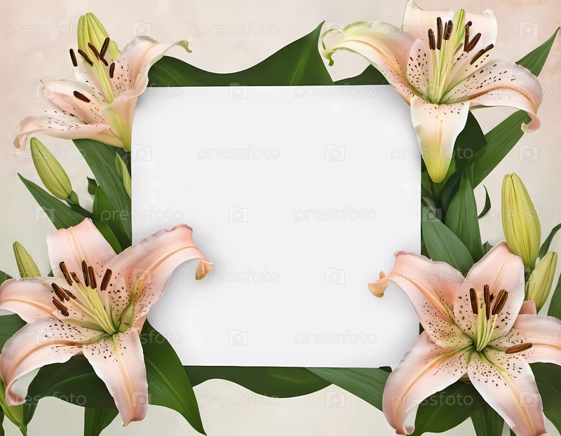 Нежные розовые лилии с темной сердцевиной и сочными зелеными листьями создают красивую рамку вокруг пустой белой области, идеально подходящую для добавления особой заметки или сообщения. Генеративный ИИ