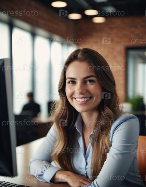 Профессиональная белая женщина в синей рубашке сидит за своим столом в современном офисе, излучая уверенность и позитив. Окружающая среда усиливает ее доступное поведение. Генеративный ИИ
