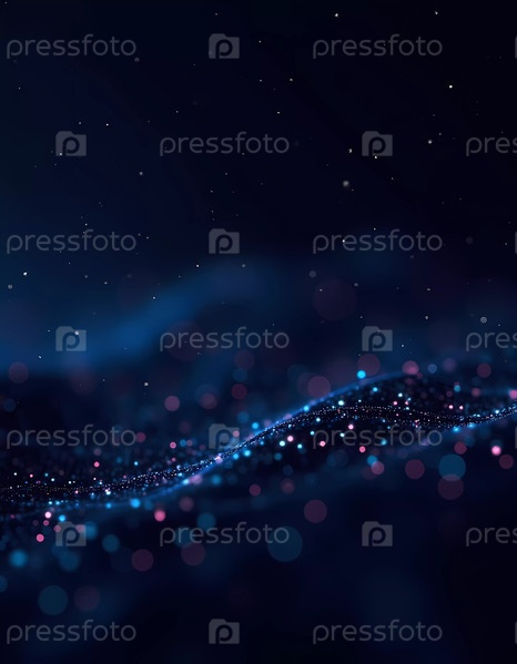 Захватывающий цифровой ландшафт иллюстрирует яркие светящиеся частицы, которые представляют данные ИИ и аудиографику. Фон темный, что усиливает визуальное воздействие. Генеративный ИИ