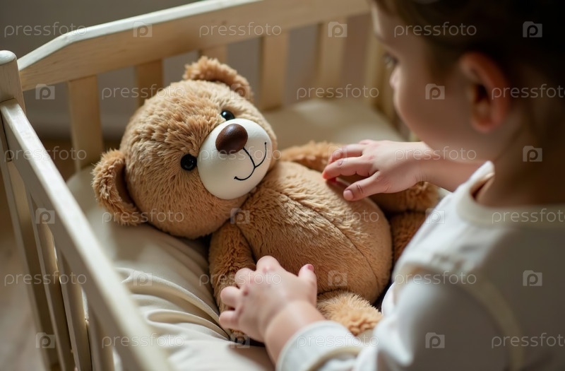 Плюшевый мишка лежит в кроватке, мягкая игрушка в детской спальне. Генеративный ИИ