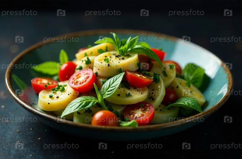 Овощной салат на темном фоне, фото еды для ресторана. Генеративный искусственный интеллект