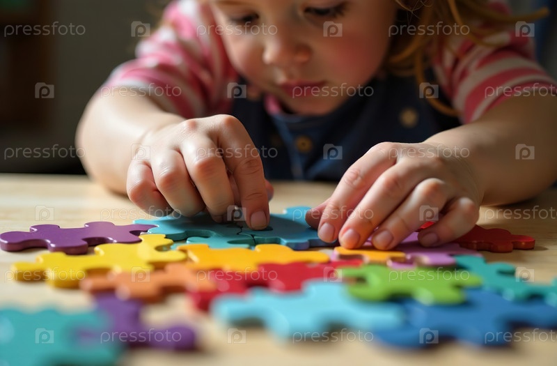 Ребенок собирает пазл в игровой комнате, игрушечная красочная мозаика. Генеративный искусственный интеллект