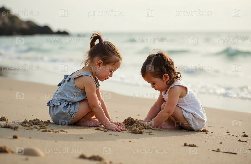 Маленькие девочки играют в песке на пляже у моря, детство малыша. Генеративный искусственный интеллект