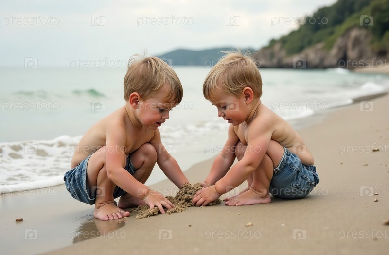 Маленькие мальчики играют в песке на пляже у моря, детство малыша. Генеративный искусственный интеллект