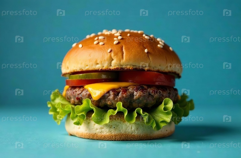 Сочная котлета бургера на синем фоне. Еда для меню ресторана. Генеративный ИИ
