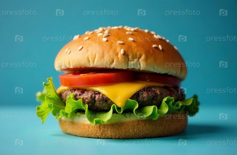 Сочная котлета бургера на синем фоне. Еда для меню ресторана. Генеративный ИИ