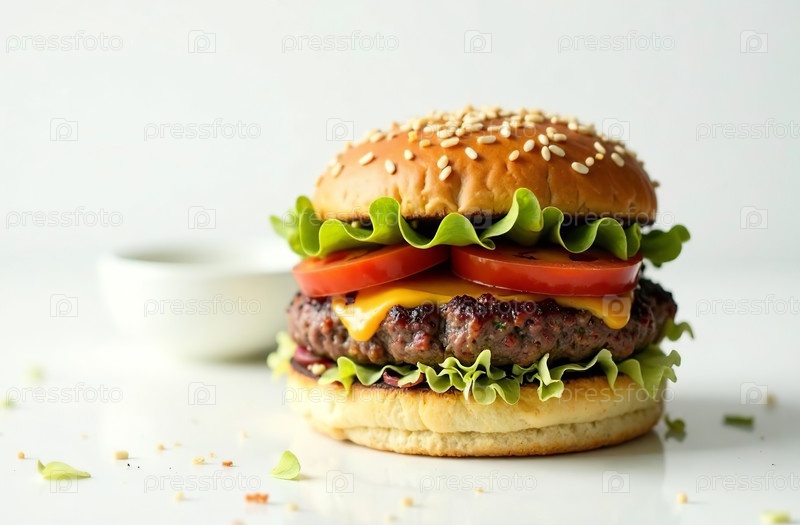 Сочная котлета бургера на светлом фоне. Еда для меню ресторана. Генеративный ИИ