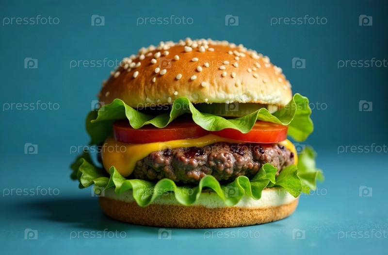 Сочная котлета бургера на синем фоне. Еда для меню ресторана. Генеративный ИИ