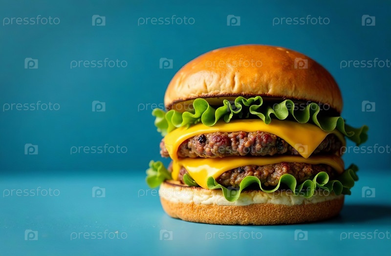 Сочная котлета бургера на синем фоне. Еда для меню ресторана. Генеративный ИИ