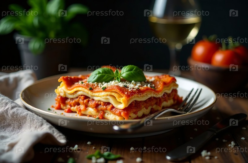 Кусок лазаньи на темном фоне, фото еды Итальянский ресторан. Генеративный искусственный интеллект