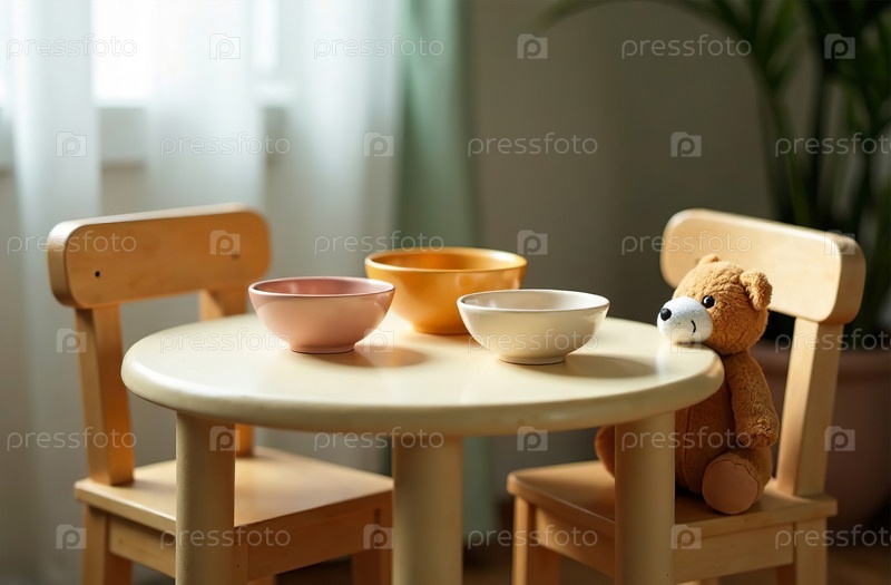Игрушечный плюшевый мишка сидит за детским столом, игра для чаепития. Генеративный искусственный интеллект
