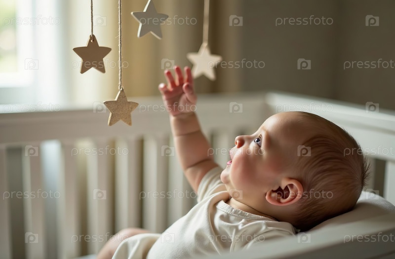 Мобиль над кроваткой, новорожденный трогает игрушки рукой, детская комната. Генеративный искусственный интеллект
