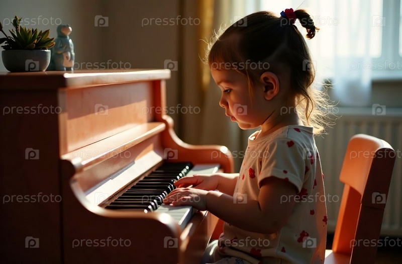 Ребенок играет на игрушечном пианино, молодой музыкант играет музыку в игровой комнате. Генеративный искусственный интеллект
