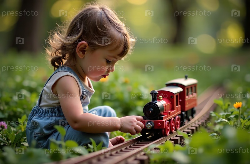 Игрушечный поезд на зеленой траве в парке, ребенок играет с железной дорогой. Генеративный искусственный интеллект