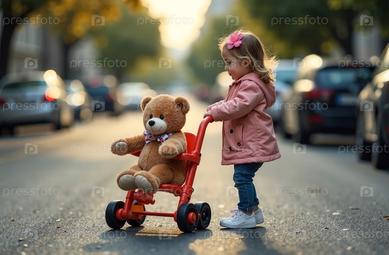 Девочка толкает плюшевого мишку в коляске на улице, игрушка в детской коляске. Генеративный искусственный интеллект