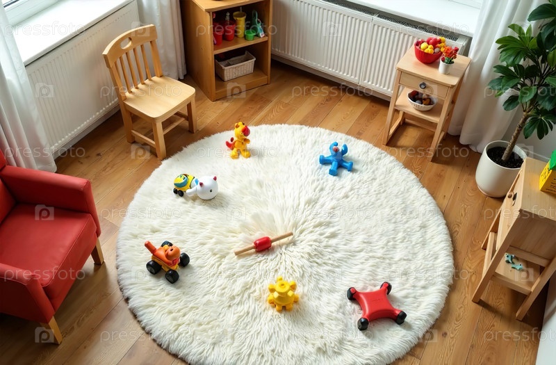 Детская игровая комната, красочные игрушки лежат на белом ковре в спальне. Генеративный искусственный интеллект